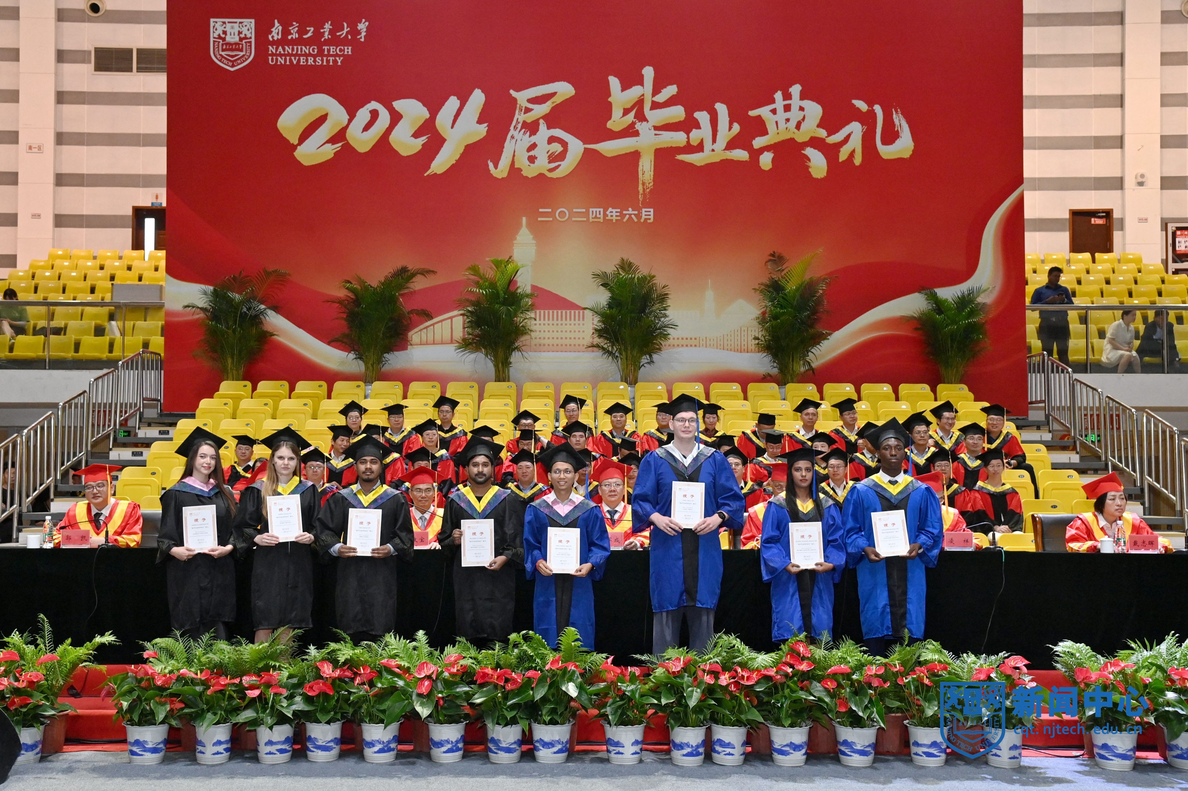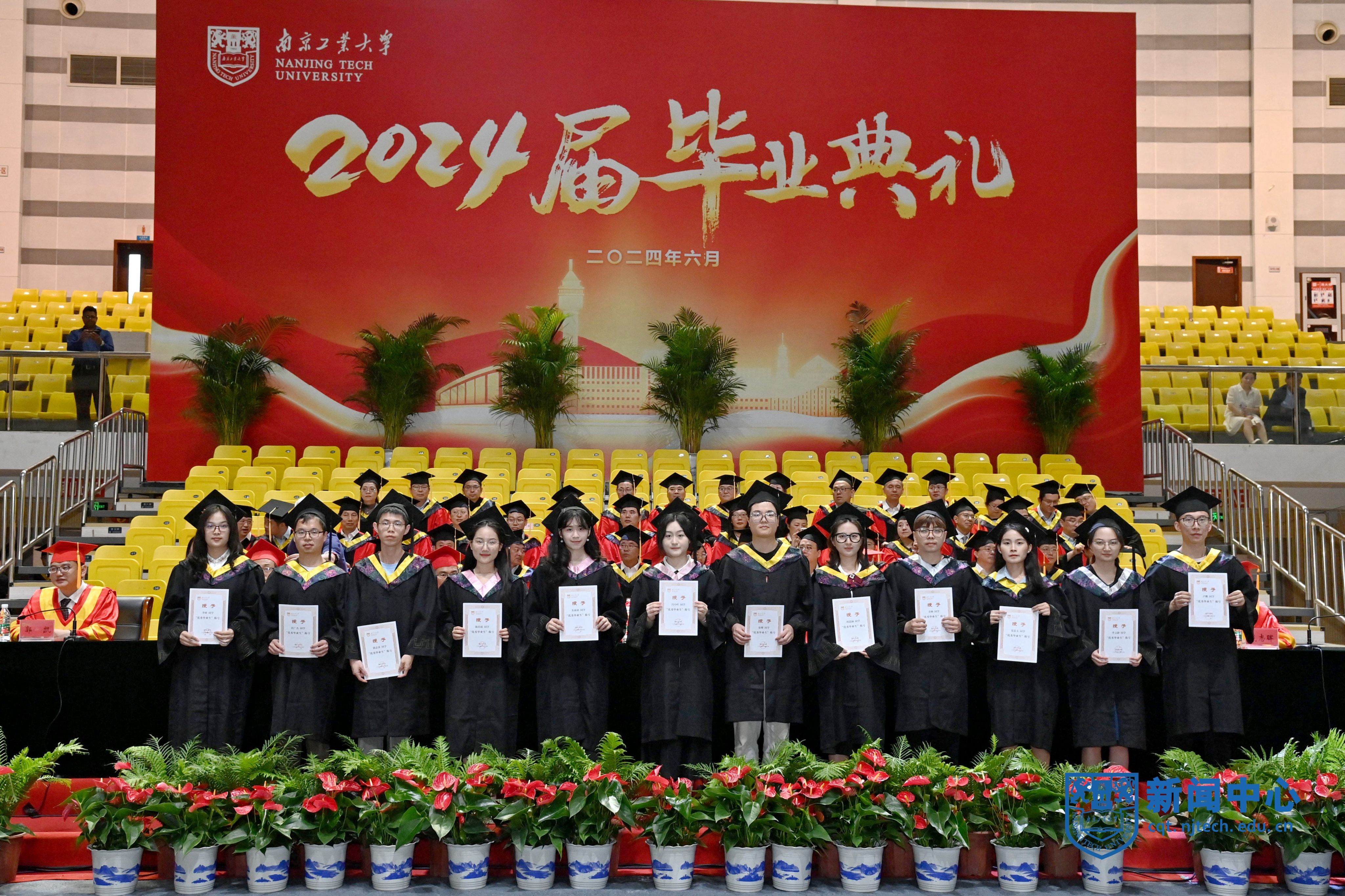 上午10时,毕业典礼在庄严的国歌声中拉开帷幕。校党委副书记吴胜红宣读《关于表彰南京工业大学2024届优秀毕业研究生的决定》,纪委书记王敦宝宣读《关于表彰南京工业大学2024届本科优秀毕业生的决定》,副校长凌祥宣读《关于表彰南京工业大学2024届来华留学生优秀毕业生的决定》,副校长戴志晖宣读《关于表彰2024年度南京工业大学“启明星计划毕业生启航奖学金”获奖学生的决定》,副校长郭凯宣读《关于表彰2024年度南京工业大学“启明星计划西部省区就业援助行动”获奖学生的决定》。校领导分别为博士优秀毕业生代表、硕士优秀毕业生代表、本科优秀毕业生代表、留学生优秀毕业生、“启明星计划”获奖毕业生代表颁发证书并授予学位。